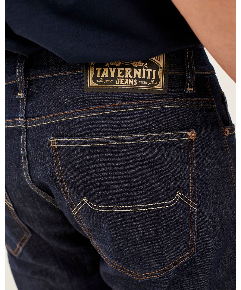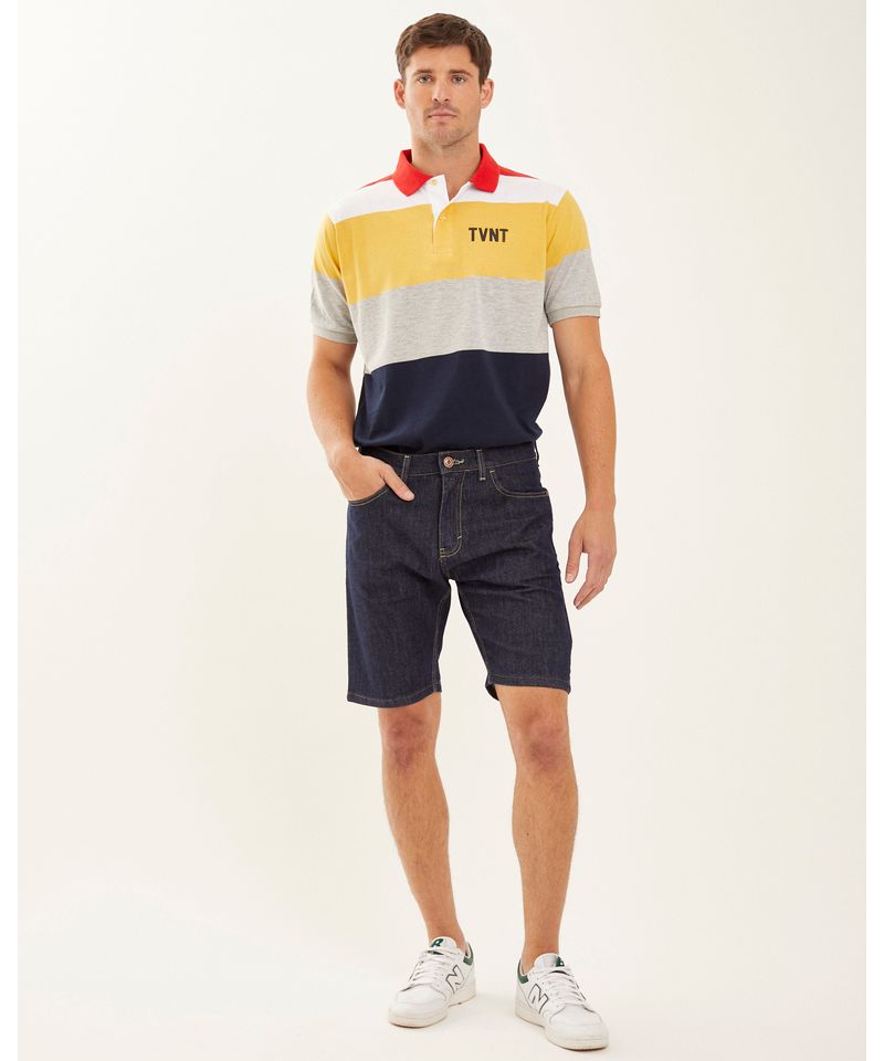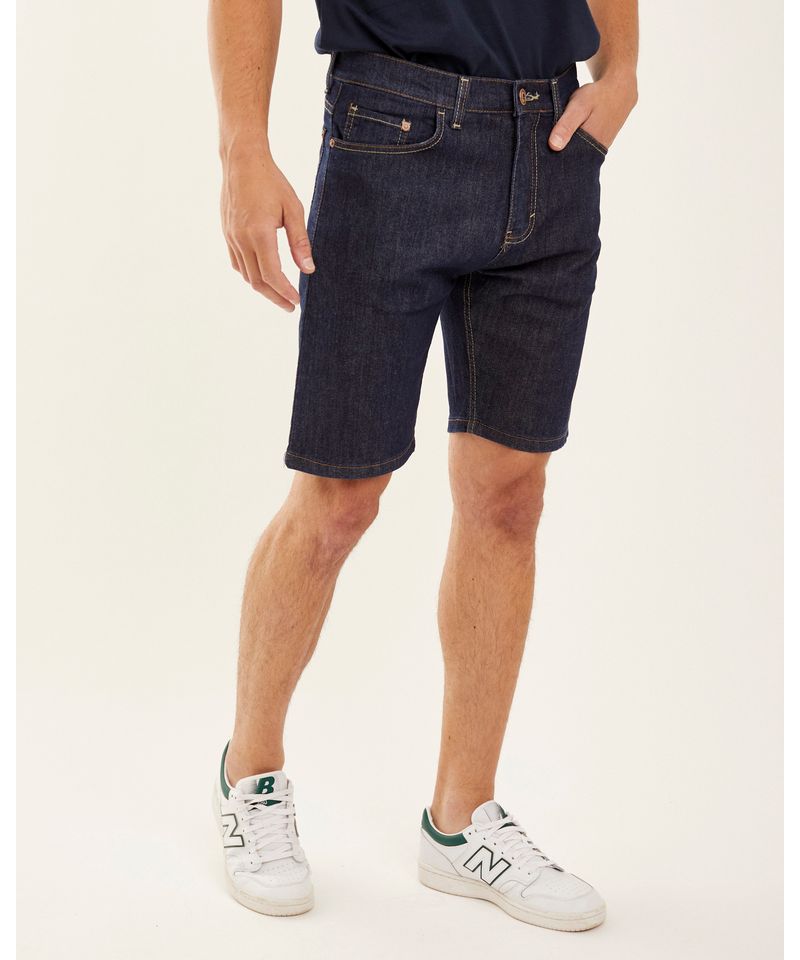 Bermuda de denim tiro intermedio, calce slim. Bolsillos traseros bordados. Serie Selvedge. Elastizado. 98 % algodón 2 % elastano