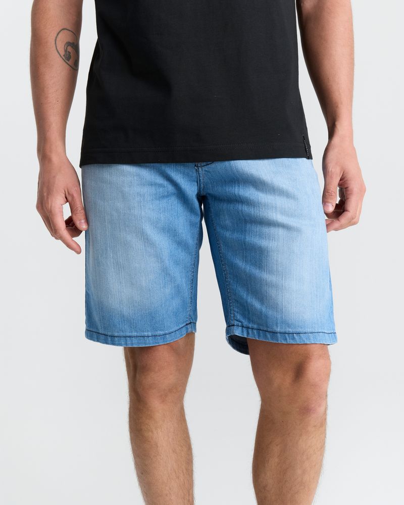 Bermuda de jean hombre, tiro intermedio, calce slim. Cartera con cierre. Bolsillos traseros bordados. Composición 98% Algodón 2% Elastano.