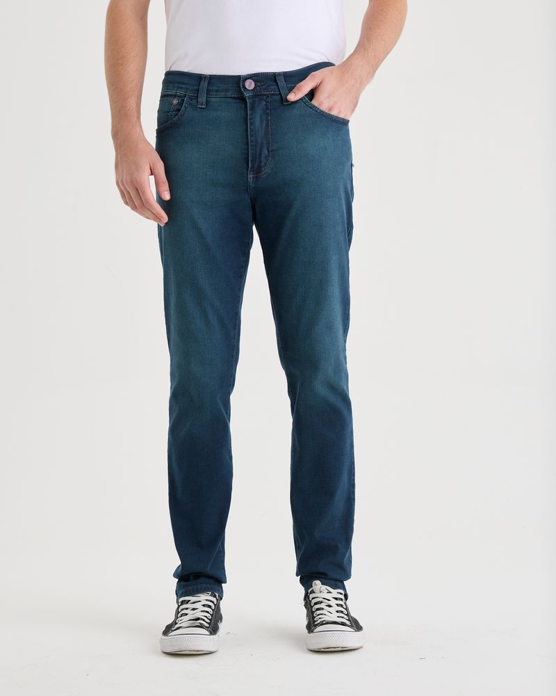 Jeans tiro intermedio, calce slim. Cartera con cierre. Bolsillos traseros con pliegue y bordado. Tejido de peso medio y elastizado. Composición: 98 % algodón 2 % elastano. Serie Fuerza Suprema