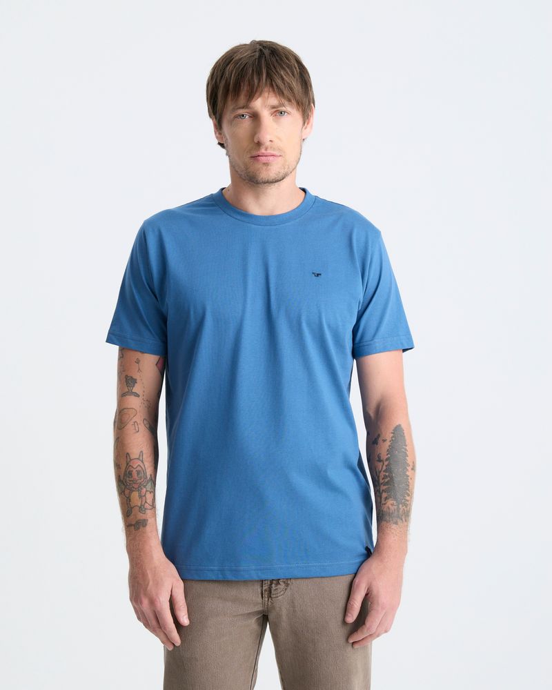 Remera básica de jersey de algodón. Calce regular, manga corta y escote redondo con cuello en tejido elastizado. Composición: colores plenos 100% algodón. Colores granizados 50%algodón, 50% poliéster.