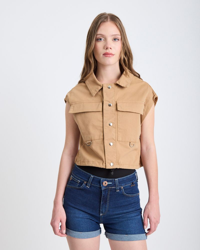 Chaleco de moda con broches snap y cordón de ajuste en ruedo. Composición 98% algodón 2%eslastano