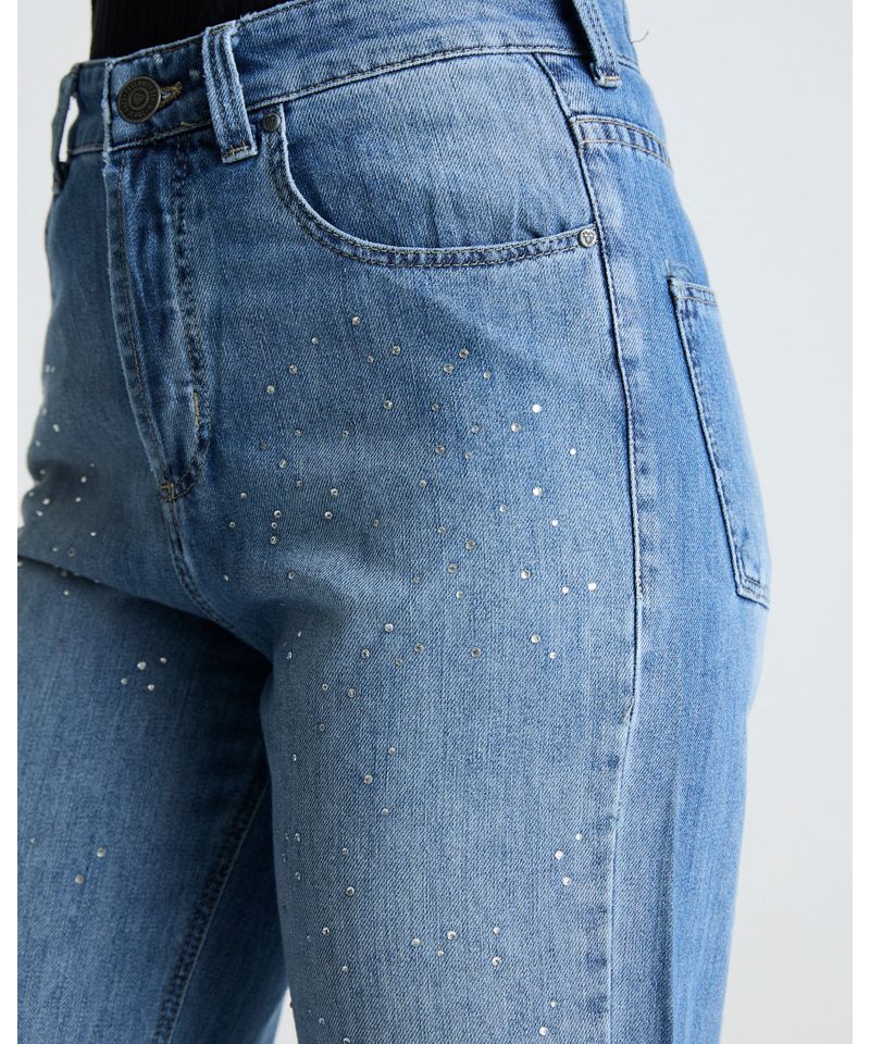 Jean dama tiro medio, bota holgada. Cartera con botones. Aplique de piedras y roturas en delanteros.• rígido • composición 100% algodón