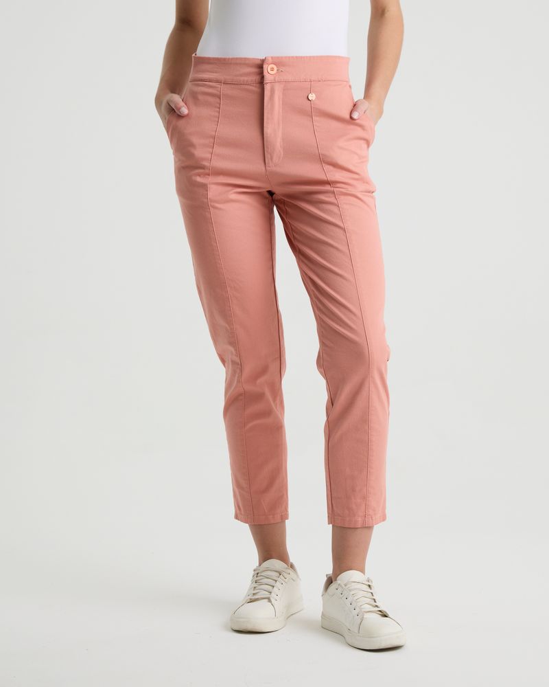 Pantalón tipo chino, tiro alto bota slim. Recortes en centros delanteros y detalle de chapa• elastizado• composición 98% algodón , 2% elastano.