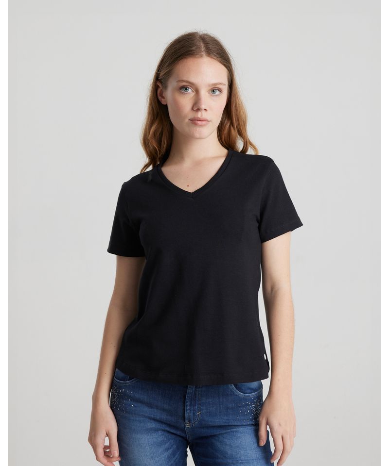 Remera básica cuello en ve y manga corta en jersey de algodón elastizado. • calce regular • composición tela principal: 90% algodón - 10% elastano.