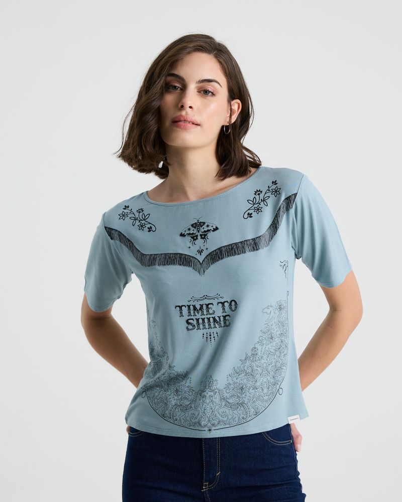 Remera cuello semi bote y manga corta en jersey de bambú elastizado. Fibra 100% natural, orgánica, antibacteriana y además antiadherente. Estampado time to shine full en el delantero.• calce regular • composición tela principal: 90% bambú • 10% elastano.