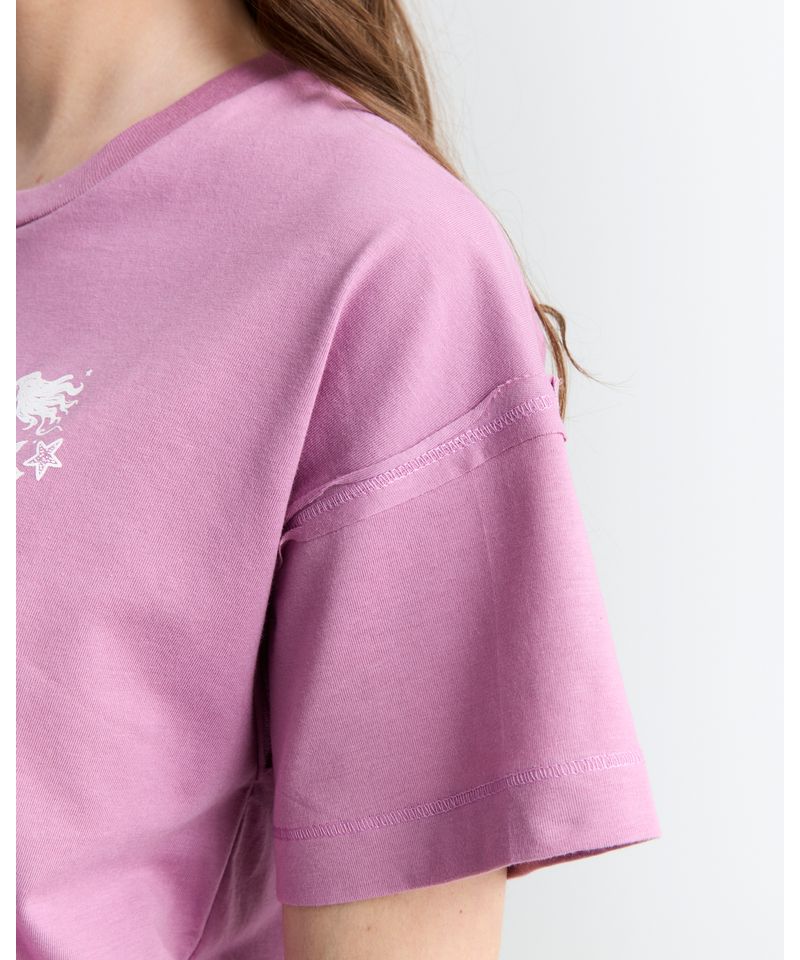 Remera escote redondo en ribb, silueta oversize con sisa al corte y detalle de costura fantasía bordador, en jersey liviano de algodón. Tejido de mano extra suave y fresca. Maxi tajos laterales. Estampado sirena y estrellas de mar versión logo en delantero y composición marina en espalda. • calce holgado • composición tela principal: 100% algodón.