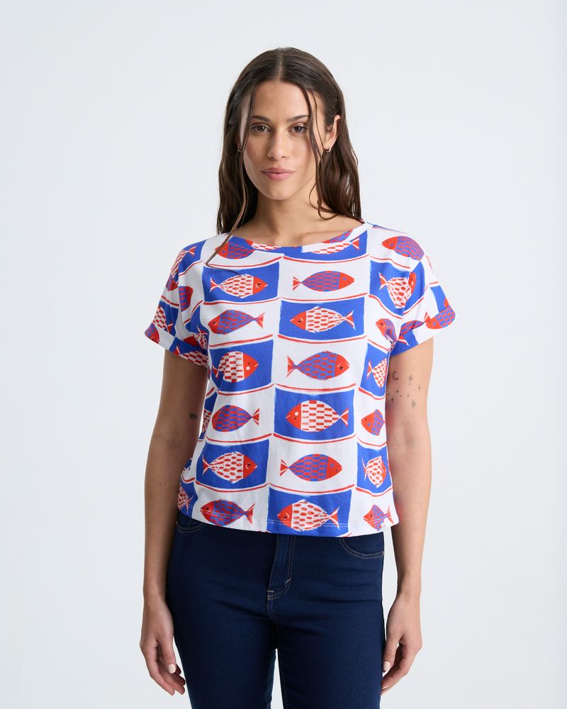 Remera escote semi bote y manga corta con sisa caída en jersey liviano de algodón. Tejido de mano extra suave y fresca. Orillo de mangas rebatidos y sostenidos por pespuntes. Estampado full print fish pattern. • calce holgado • composición tela principal: 100% algodón.